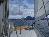 Safely through the tidal current Rystraumen we sighted the passengership ”Hurtigruten Nord Norge” a bit south. Last time we met “her” was in Patagonia, Chile, in 2007. In Chile we had a long chat with the captain onboard Nord Norge over the VHF-radio, both being Norwegians in foreign water. When we called the ship on the VHF radio this time, the meeting far south in Patagonia was unknown to the radio officer. But - when the ship a few minutes later came within close range, Nord Norge blew the whistle loudly for several seconds. We took it as a sign of officers on bridge finally recognizing Empire, after overhearing the conversation on the VHF radio – we greeted by taking the flag down and up again. It’s strange what an unexpected meeting in foreign waters can lead to! Well – it was probably a bit strange to be back in Norway after many years underway…
